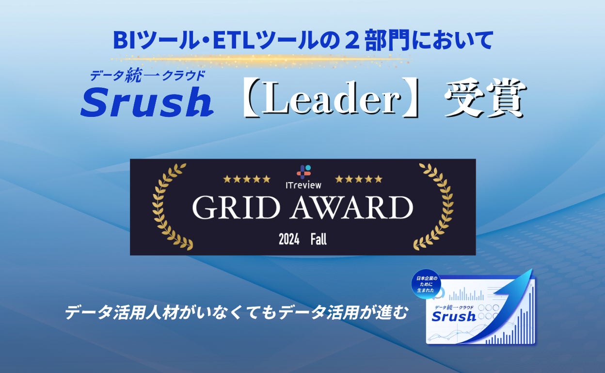 データ統一クラウド「Srush」が、「ITreview Grid Award 2024 Fall」において2部門(BI ツール/ETLツール)で【Leader】を受賞