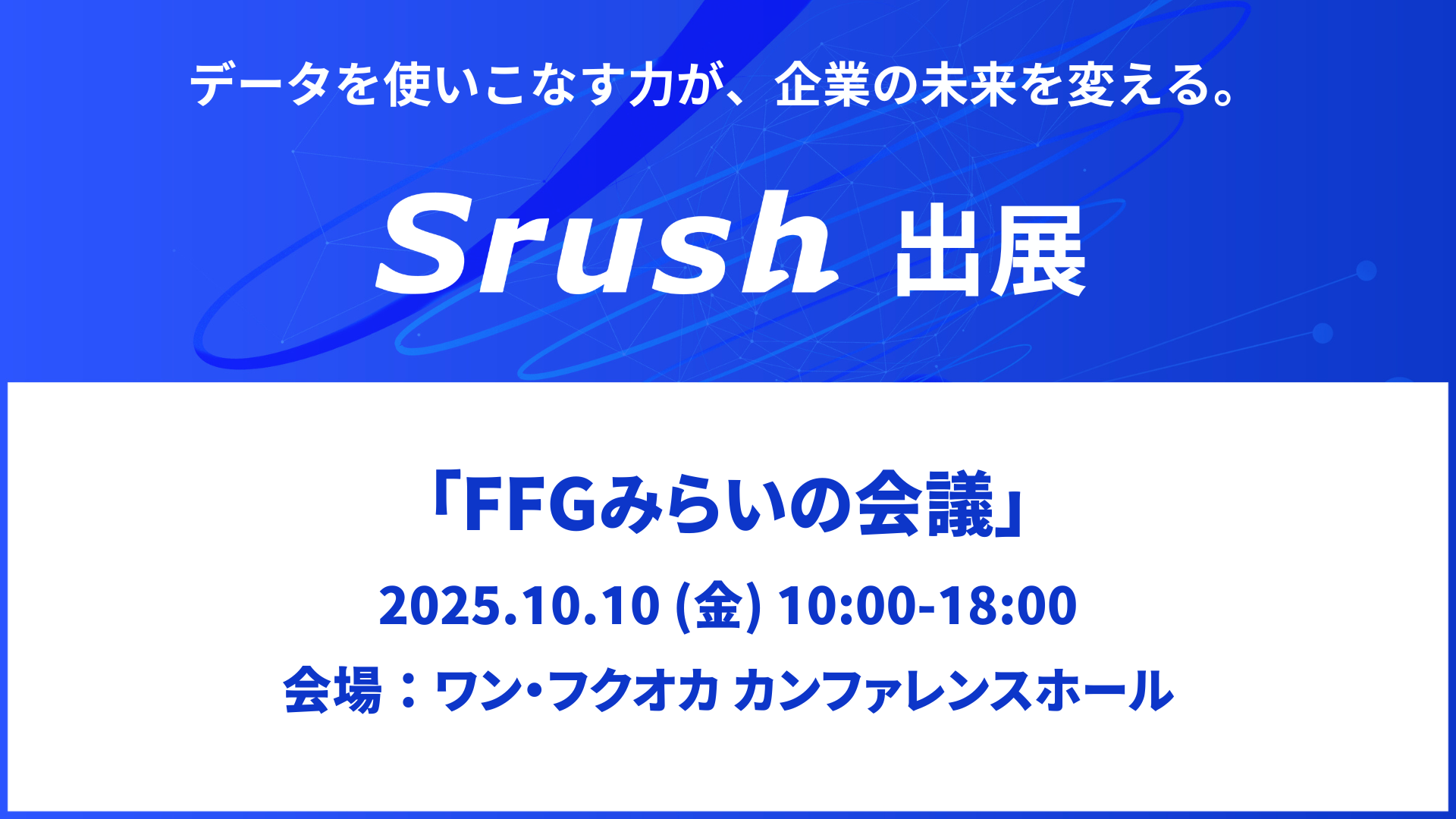 2025年10月10日(金)に開催される、FFG(ふくおかフィナンシャルグループ)主催「FFGみらいの会議」にSrushがブース出展いたします。ブースでは「SrushAI」のデモ画面に触りながら、ワンクリックでのデータ分析を体験できる場などをご用意しております。この機会に、ぜひお立ち寄りくださいませ。