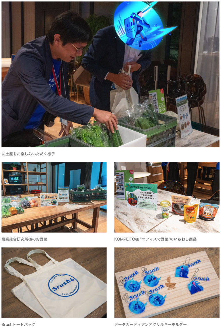 ユーザー企業の皆さまの商品をお土産として、農業総合研究所様のお野菜やKOMPEITO様 ”オフィスで野菜”のいちおし商品を参加者の方々にお持ち帰りいただきました。あわせて、Srushオリジナルのトートバッグやデータガーディアンキーホルダーも配布し、「お土産が充実していて嬉しかった」というお声も頂戴しました。