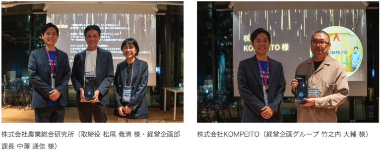 社内に複数のガーディアンが育ち、データ文化が根づく企業を「Data Guardians of Japan」と称し、その歩みを讃えるのが本賞です。今年は、データ活用によって組織変革を遂げた株式会社農業総合研究所、株式会社KOMPEITOが受賞されました。