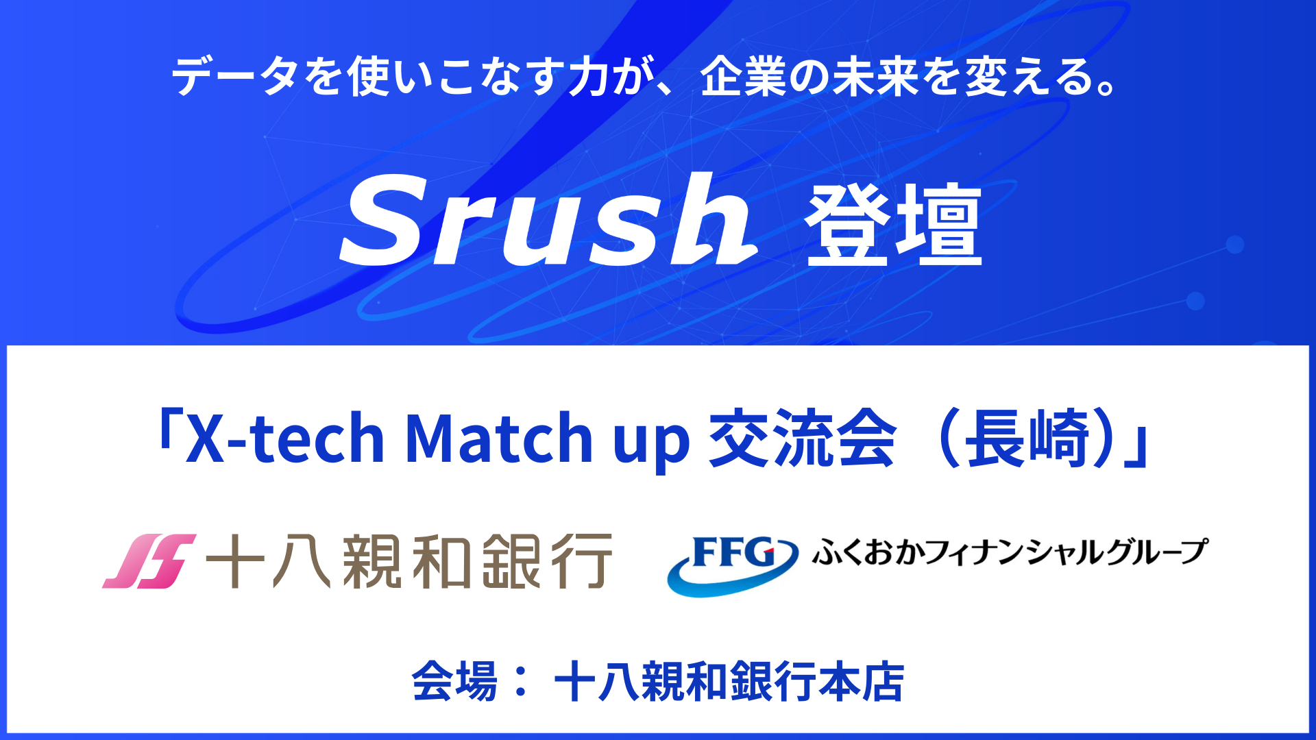 株式会社Srushは、2025年12月10日(水)に十八親和銀行本店(長崎県長崎市)にて開催された「X-tech Match up 交流会 長崎」に登壇しました。 本イベントは、十八親和銀行様・FFGベンチャービジネスパートナーズ様が主催し、地域企業とスタートアップの出会い・共創を目的として開催されたものです。当日は、物流・製造・建設業を中心とした十八親和銀行お取引先企業 約50社と、スタートアップ10社が参加しました。