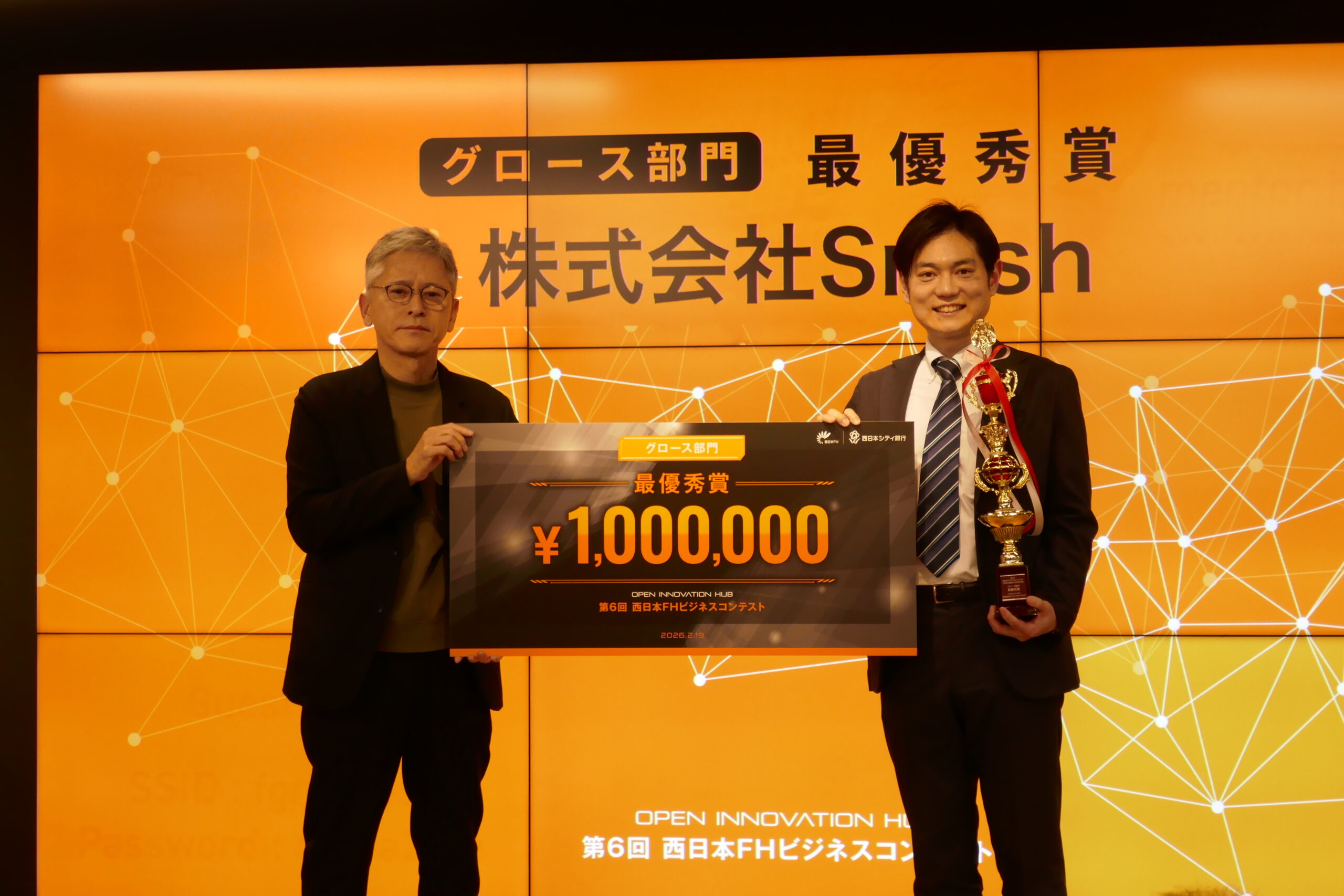 表彰式当日の様子 (左)西日本シティ銀行 取締役 専務執行役員 尾﨑氏、(右)株式会社Srush 代表取締役 樋口 このたび当社は、2026年2月19日(木)に開催された「第6回西日本FHビジネスコンテスト」において、グロース部門の最優秀賞を受賞いたしました。本コンテストは、西日本FHグループおよび地場企業との協業を通じ、地域経済の活性化や地域課題の解決に資するビジネス創出を目的としたオープンイノベーション型の取り組みです。第6回となる今回は全国153組の応募があり、厳正な審査を経て、当社の取り組みに高い評価をいただきました。 <第6回西日本FHビジネスコンテストのHP>https://oihub.nnfh.co.jp/