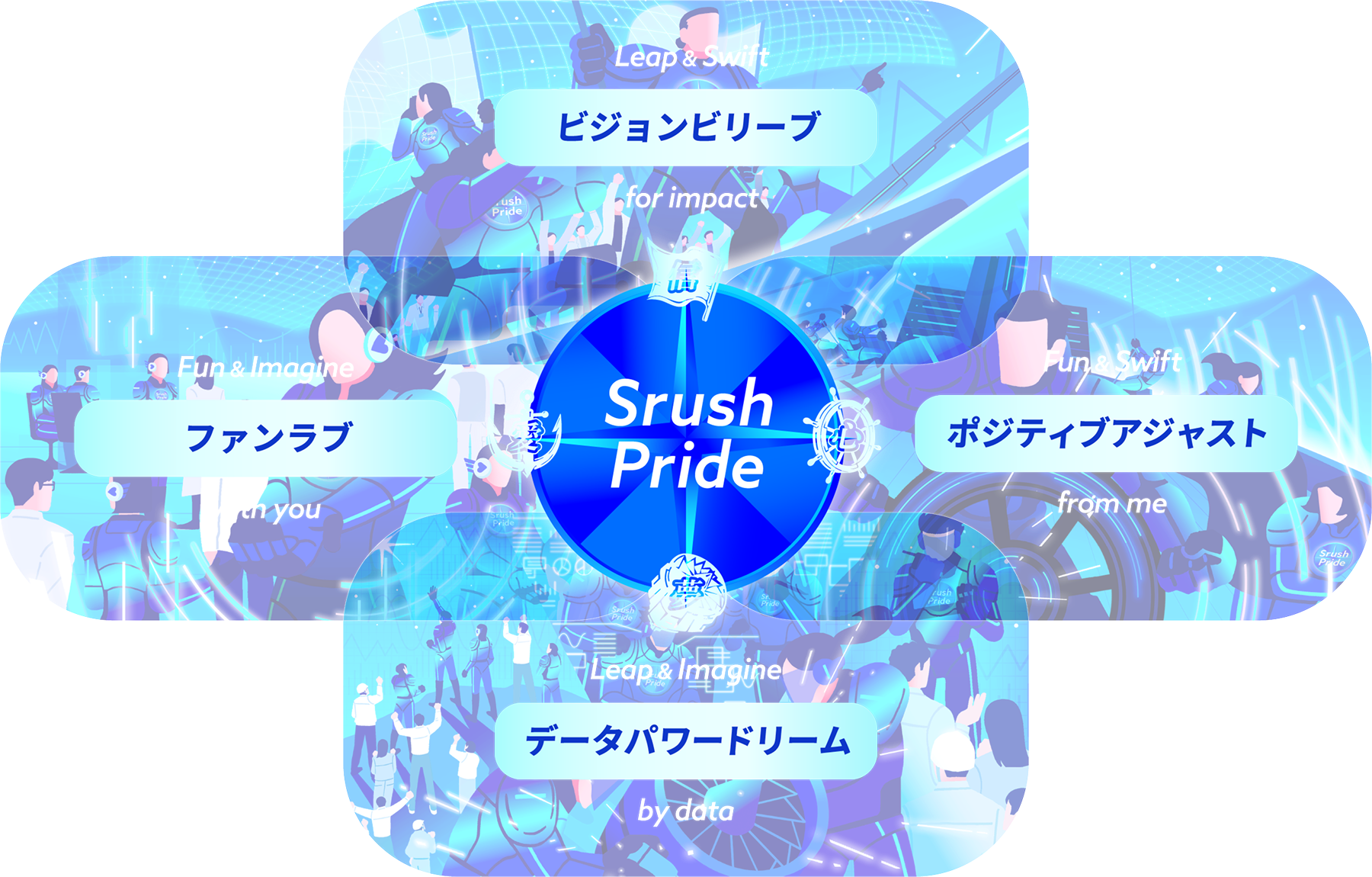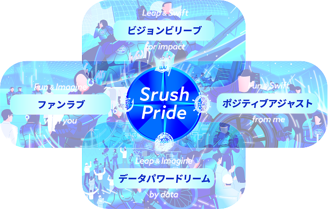 我々が定義するプライドとは、予測不能な変化を見せるデータの海の航海を乗り越えて、目的地へ到達するために絶対に必要な要素です。クルー達がこの4つを航海の羅針盤にすることで、この航海を必ず成功させる。私たちはそれを、Srush Prideと呼ぶ。